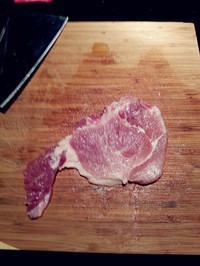 用平底锅,倒入薄薄的一层油。中小火。把猪排放入,猪排会边煎边出油,两面煎到金黄,大概每面2-3分钟。