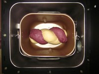 将揉好的面团取一半出来,剩下的一半留在面包机里,放入紫薯粉和一小勺水.
