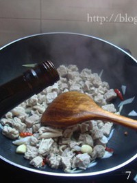 另锅下油,爆香大葱、姜、蒜、花椒、干红辣椒