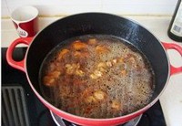 至冰糖溶化呈焦红色,倒入鹅肉翻炒上糖色