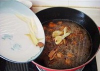 将葱段、姜片、花椒、大料、桂皮、草果等调料放进去