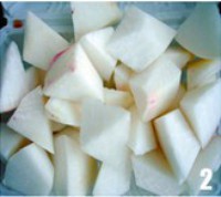 将煮过第一遍的牛肉盛出,用温水洗净浮沫,切成麻将大小的方块,原来煮过肉的水倒掉不要