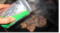 将准备好的铁锅扣在那杯啤酒上,再快速倒扣过来,啤酒杯就立在铁锅上了,会因为锅底不平的原因溢出一些啤酒,不过没关系,要的就是啤酒慢慢渗出的效果