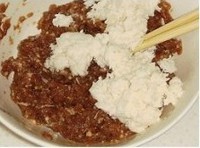 在面包屑中加入牛奶,完全浸软后倒入肉馅中