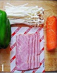 依次放入胡萝卜丝、青椒和金针菇