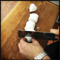 芭比娃娃玩具清洗干净,然后用保鲜膜包好,两个六寸的戚风蛋糕摞起来,然后修理边缘,再用修剪下来的边缘部分继续往上摞成裙子的形状