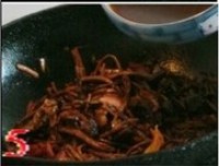 倒入压干茶树菇的原汤一碗。中火烧制汤汁基本收干