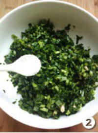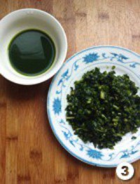把菠菜的水分挤干,菠菜水可弃之或另作他用(我用来做了绿色的手擀面)
