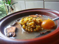 捞起汤渣看到绿豆已经煲至开花即可。饮用时可加入适量的精盐调味。