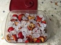 把清理干净的山楂果肉放在特百惠微波专用盒,均匀倒入冰糖