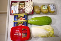 菌菇、西葫芦片、土豆片、午餐肉,添一勺韩国辣酱,盖上锅盖焖煮8分钟;