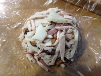 取保鲜膜一张,将边角料压如空碗中压实再倒扣在保鲜膜上,准备码盘。