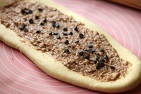 面包机完成了第一次发酵后,会再搅拌几下排气,然后就会发出提示音。把面团取出放在撒了干粉的操作台上,用擀面杖擀成椭圆形长条状,均匀抹一层香蕉花生酱,我还额外多撒了几颗巧克力豆,可以省略。不要抹太厚。