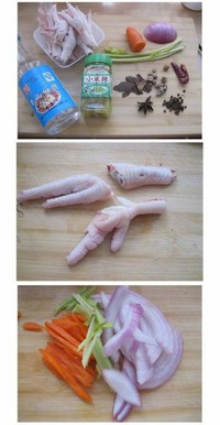 鸡爪洗净,剪去脚尖,每1只剁成3小块,洋葱切丝,胡萝卜切丝,西芹切段