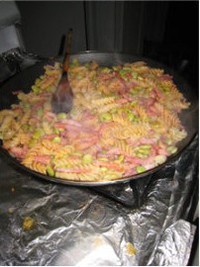 煮好的意面和毛豆用笊篱捞出,沥去水