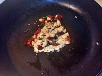 平底锅下少量油,放入蒜米与干辣椒爆香。