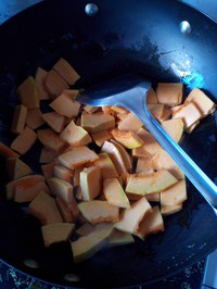 锅里放适量油,少量盐,下南瓜翻炒。