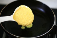 用勺子将豆渣糊在锅的中心位置倒入,轻轻旋转平底锅,使豆渣糊散成圆形,盖锅盖,小火煎至一面金黄色。