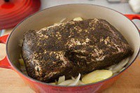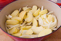 在洋葱和苹果里加入2汤匙橄榄油,用一点盐和胡椒调味,垫在烤盘底层(带盖的厚底锅也可以)。将腌好的猪肘放在洋葱和苹果的上面。