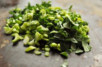 加入米饭,将米粒炒散,和青菜炒匀;然后加适量盐调味。
