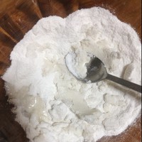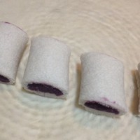 紫薯用勺子压成泥,戴上一次性手套把紫薯泥撮成长条??