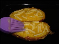 将拌好的地瓜泥再填回地瓜壳里,上面再洒上适量芝士碎。