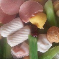 鸡汤入锅加水煮开后放入莴笋条,红枣,虾饺,蟹黄包,鱼丸等