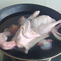 加入酱油,开水,茴香桂皮,黄酒大火烧,至鸭子染红后加糖中火收汤汁,最后留一小碗汤汁。