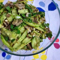 调味汁与黄瓜酱肉拌匀 再折几根香菜下去就可以啦。