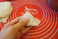 手指蘸水往云吞皮内侧扫上一点水,向一个点进行折叠。