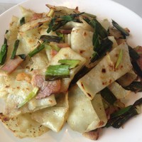 下腊肉不用给油…(腊肉自带油)炒一炒有香味以后下大蒜有一点香味以后下刚才煎好的豆丝~