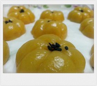将所有材料混合,和成面团。再分成25克左右的一个小面团,用牙签做出南瓜的形状,我没有准备南瓜柄,就点了一些黑芝麻。