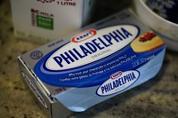 将所有材料准备好.将奶油芝士切成一小块一小块放在碗内,放置桌面.(放在室温,让它变软.)