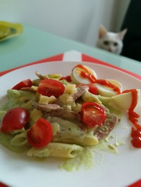 装盘,依个人喜好可以撒上起司碎,扔几个番茄Ds上去装点一下,然后熟鸡蛋切片画道番茄酱什么的,有条件的也可以像我一样请个喵星人来当背景防止作品太烂被点XX。