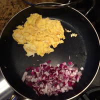 鸡蛋炒半熟划到一边入洋葱丁翻炒,炒出香味