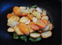 依次把小土豆、胡萝卜、金丝瓜煎制成金黄色取出