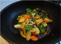 金丝瓜去皮去籽洗净后切成条,胡萝卜、小土豆去皮切大片;青椒用手掰成瓣