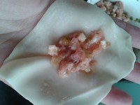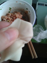 取一点肉馅放入馄炖皮中间