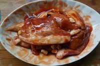 把肉放在盘子里,加料酒、蒜瓣、老抽、叉烧酱。这个叉烧酱的优劣直接决定了成品的品质,我用的是李锦记的叉烧酱,他家的各种酱料一直都不错。