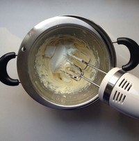 将奶油吉利丁液分三次加入芝士糊中,搅拌均匀。