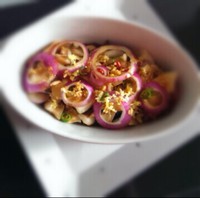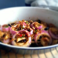 堆上洋葱圈和杏鲍菇,喜欢吃辣的话放些辣椒粒。淋上调好的酱汁(老抽+生抽+糖+姜末+蒜末),最后淋上一些麻油,腌制一会。烤箱190度预热后,包上锡纸中层烤15分钟。