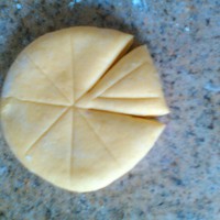 在错开方向压十字形状,共八条线条,将面团面上用刀切开两条线条,中间不要切开,成一片花瓣