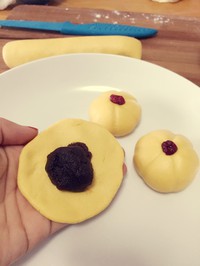南瓜出水量很大,糯米粉不够里面加了玉米粉还有少量的面粉,慢慢揉成面团,手指压下去不要太湿,太软。不然不好包红豆沙。