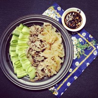 小黄瓜刨成薄片肥牛或鸡胸肉水里煮熟后捞出放凉拌好海蜇我用的是即食的海蜇