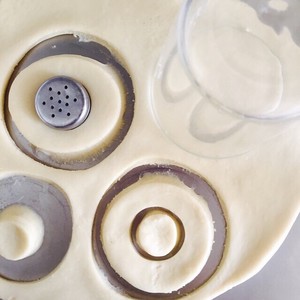 把面团排气擀薄,家里没有神器就用手边的杯子啊什么瓶盖也可以,按成圈圈状,剩余的边边角角重新揉成面团,擀成面皮,如此反复,最后剩下的随便弄个形状就好;烤箱放一碗热水,进行二次发酵,差不多20-30分钟即可,