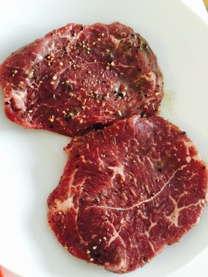 牛排两面都撒上黑胡椒碎、拧上新鲜柠檬汁少许,均匀撒盐,涂匀。