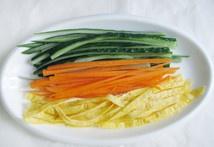将胡萝卜、黄瓜和韩国泡菜也切成丝备用