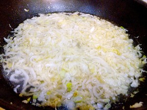 锅热中放油,油热放入蒜片、葱段、姜丝爆香。