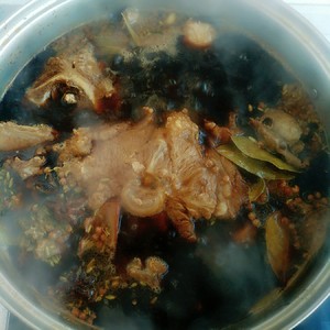 2勺(炒勺)老抽,半碗料酒(我喜欢花雕),花椒大料香叶桂皮辣椒,干黄酱,孜然粒,一起加入。