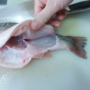 我个人喜欢买400-500g的鲈鱼,正合适。鱼去除内脏后洗净,沿着刀口在尾部斜切一刀。